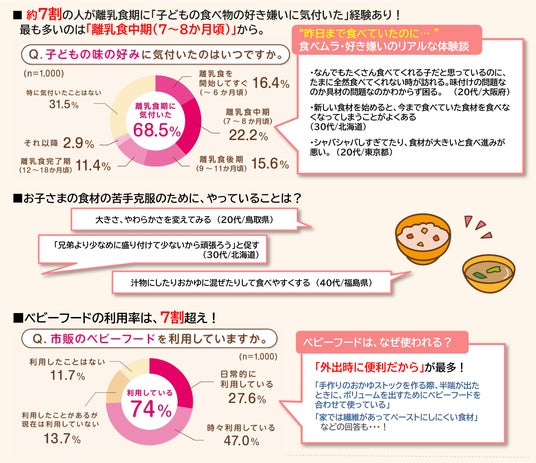 調査の結果、約7割のママ・パパが離乳食期に「子どもの好き嫌いや味の好みに気づいた経験がある」ことが明らかになりました。「昨日まで食べていたのに食べなくなる」「食材の大きさで口にしない」といった声も多く、食事への悩みがうかがえます。一方で、ベビーフードの利用率は7割超。外出時の携帯用をはじめ、「手作りに組み合わせて使う」「調理しにくい食材を補う」など、多様な場面で活用されている実態がわかりました。