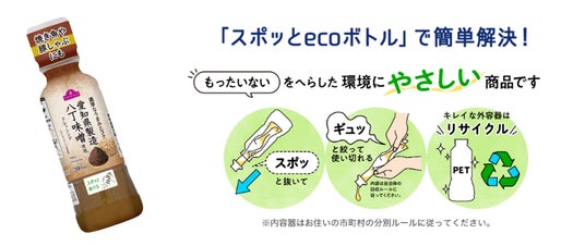 ドレッシング容器は中身がドロッとしており洗浄工程で油を完全に落とすことが難しいため、リサイクルに組み込める「PET容器」ではなく「その他プラスチック包装」に分類されています。このたび、内側と外側を別々に引き抜ける形状の「スポッとecoボトル」を採用することで外容器をリサイクルできるようになりました。内容器は薄いフィルム状の容器を使用しており、引き抜いた後に最後まで絞り出し無駄なくお使いいただけます。容器全体の重量の54%を占める外容器がリサイクル可能となります。お客さまからは「簡単に分離できる構造は便利。ほかのドレッシング容器にも採用してほしい」といったお声をいただき、同容器を採用した国産素材使用のドレッシングを今回9品目に拡大しました。