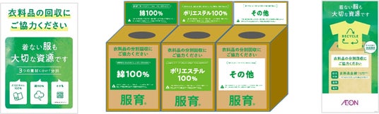イオンリテールでは9月19日(金)~10月5日(日)まで、「イオン」「イオンスタイル」約270店舗の衣料品売場に回収ボックスを設置し、不要になった衣料品をポリエステル100%、綿100%、その他の3つにお客さまご自身に分けていただく分別回収を実施します。