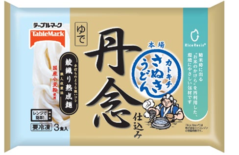 讃岐うどん専門店より「おいしい!」と言われる冷凍うどんを目指し、しっかりとこねた生地を熟成したのち、縦・横(綾状)に延ばす独自製法「綾・熟成法」により、なめらかでもちもち食感のうどんに仕上げました。また生地をカットする際に、包丁で不規則な幅で乱切りすることで職人が手打ちしたような麺線に仕上げています。