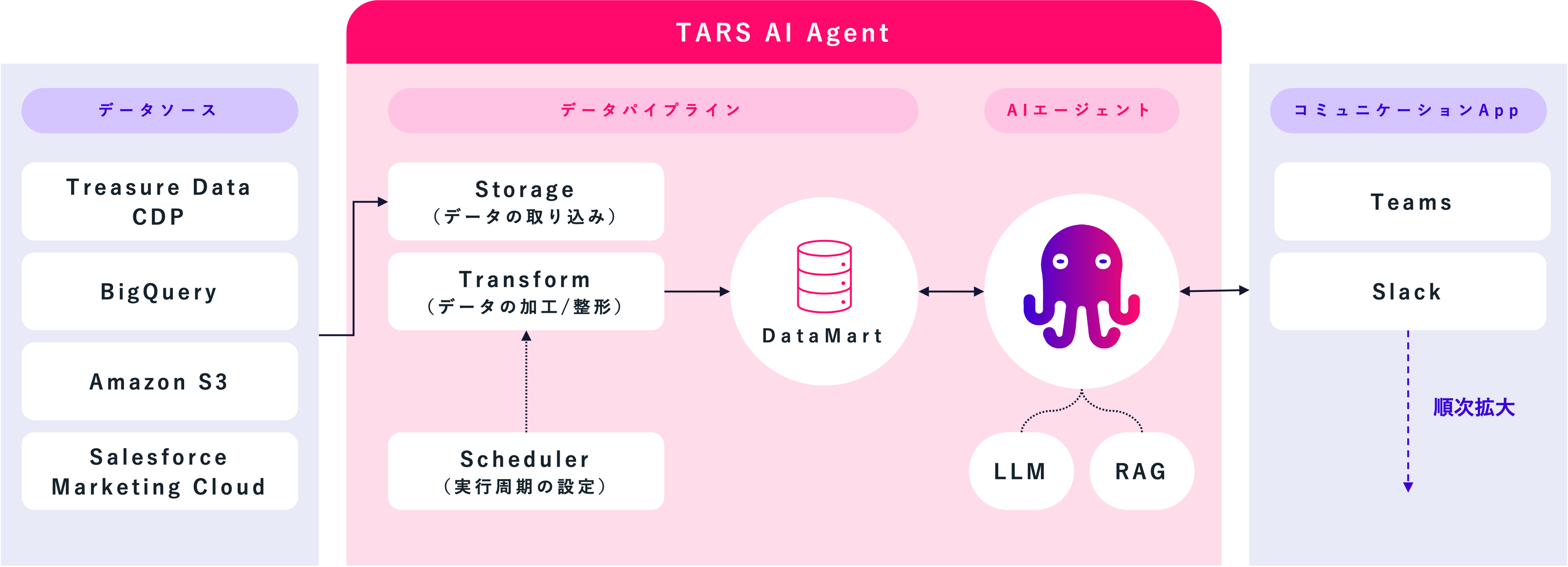 データ探索に特化したAIエージェント「TARS」では、お使いのデータソースと連携してデータを分析し、連携したコミュニケーションアプリに結果を出力いたします。