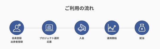 会員登録後、出資者情報をご登録いただき、成立前書面の確認・プロジェクトを選択し、ファンドへの出資の応募が可能となります。その後、厳正なる抽選の上、出資を確定し、契約・入金手続きを経てファンドの運用を開始。運用期間終了後、財産管理報告書を送付し、償還日に登録口座に分配金を入金します。