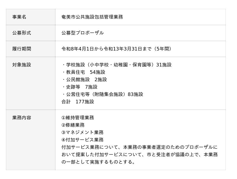 今回導入される「奄美市公共施設包括管理業務委託」は、上記公共施設マネジメントの一環で、市が保有する対象施設の保守管理、点検、維持管理業務を民間事業者に包括的に委託し、施設の総合的かつ計画的な管理を目的とするものです。