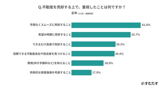 不動産を売却する上で重視したことについては、「手間なくスムーズに売却すること」が61.6%で最も多く、次いで「希望の時期に売却すること」が52.7%、「費用(仲介手数料など)を抑えること」が39.3%と続きました。これらの結果から、不動産を売却する際には、「コスト」「価格」「時期」「信頼性」といった複合的な要素が重視されていることが伺えました。