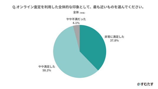 オンライン査定を利用した全体の印象として、96.0%が「非常に満足した」(37.8%)または「やや満足した」(58.2%)と回答しており、高い満足度であることが明らかになりました。
