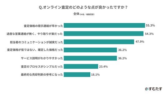 良かった点としては、「査定価格の提示連絡が早かった」(55.3%)、「過度な営業連絡が無く、やり取りが楽だった」(54.3%)「担当者のコミュニケーションが誠実だった」(47.9%)などが挙げられました。一方で、「最終的な売却判断の参考になった」については18.1%に留まりました。これは、オンライン査定が提示する価格の不確実性や、利用者が売却プロセスの初期段階での情報収集ツールとして認識していることがわかりました。