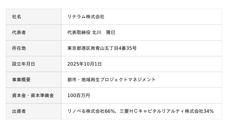 このような背景から、両社は2025年2月に資本業務提携契約を締結し*4、リノベるの企画・設計施工・運営まで一貫したプロジェクトマネジメント機能と三菱HCキャピタルの不動産再生投資、アセットマネジメント機能を活用した両社協働による新規事業の開発などを検討してきました。そして今般、両社の機能を活用して不動産の取得から再生による資産価値の最大化まで一貫したプロジェクトを共同推進し、都市・地域再生プロジェクトマネジメントを行うJVとして「リテラム株式会社(英名:RterraM, Inc.)*5」を設立することを決定しました。