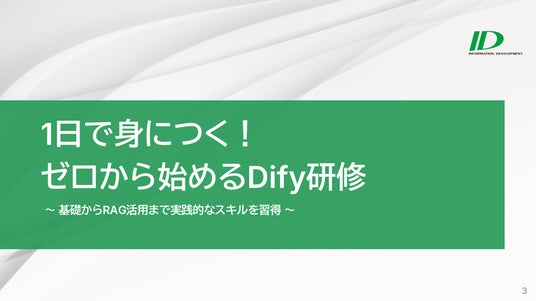 株式会社インフォメーション・ディベロプメント(本社:東京都千代田区、代表取締役社長:宮澤 拓哉 以下、当社)は2025年10月、企業向けにAIの専門知識やプログラミング経験がなくても、AIを活用するための実践的なスキルを身につけることができる「ゼロから始めるDify研修」をリリースしました。