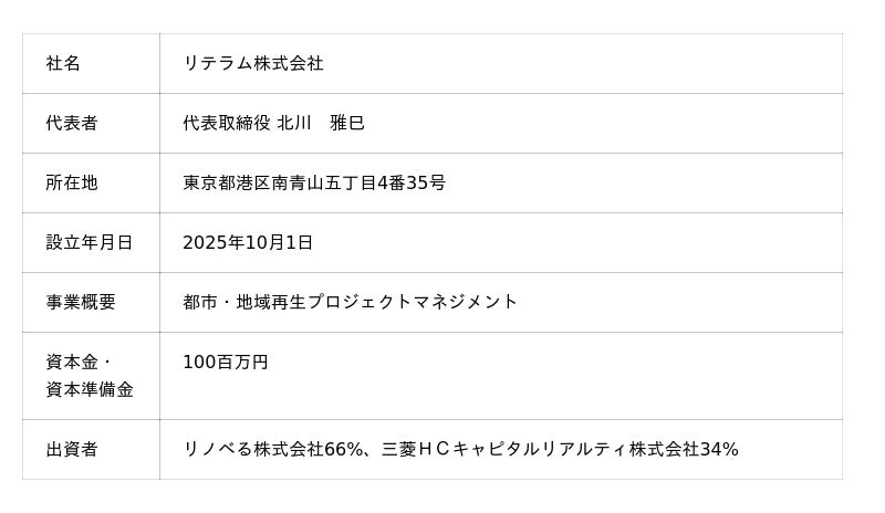 このような背景から、両社は2025年2月に資本業務提携契約を締結し*4、リノベるの企画・設計施工・運営まで一貫したプロジェクトマネジメント機能と三菱HCキャピタルの不動産再生投資、アセットマネジメント機能を活用した両社協働による新規事業の開発などを検討してきました。そして今般、両社の機能を活用して不動産の取得から再生による資産価値の最大化まで一貫したプロジェクトを共同推進し、都市・地域再生プロジェクトマネジメントを行うJVとして「リテラム株式会社(英名:RterraM, Inc.) *5」を設立することを決定しました。