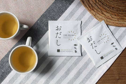 日本食文化のベースである「うまみ」を体験できる出汁パックをご用意。地域ごとに特色を生かし5種類(北海道・東北/関東/北陸・東海/関西/中国・四国・九州)のオリジナルブレンドで、国内外のお客様に日本らしさをお届けします。お部屋で湯を沸かし、出汁の香りに包まれるひととき、その香りの奥にある「地域」と「日本」を感じていただきたい。