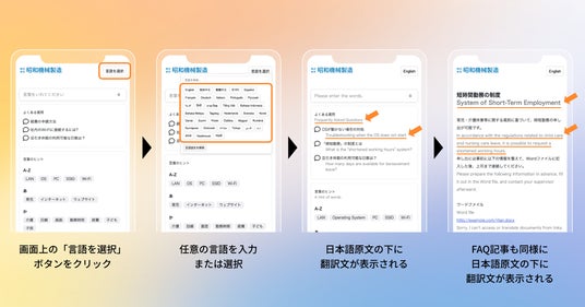 FAQ画面で言語を選択すると、日本語原文の下に翻訳文が表示される流れを示した操作手順イメージ画面