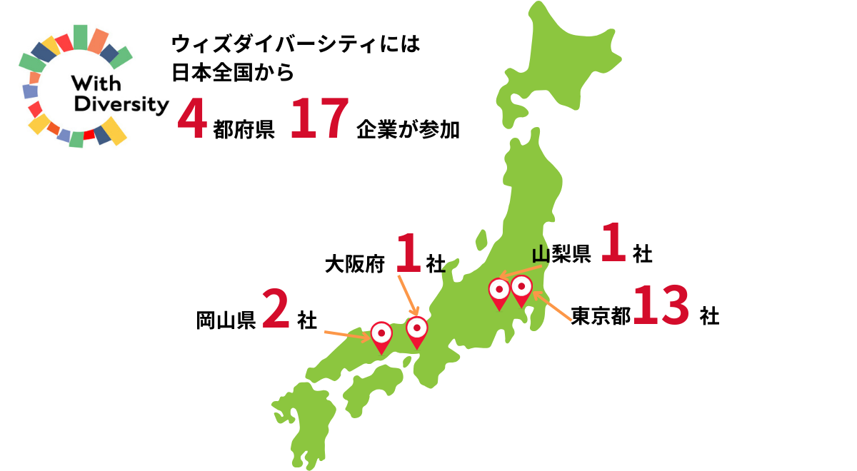 2025年7月現在、ウィズダイバーシティの参加企業は17企業となり、日本で最も多くの企業がグループ算定されています。東京都以外には大阪府・岡山県・山梨県の企業が参加しており、組合全体での実雇用率は6.63%(※2)です。