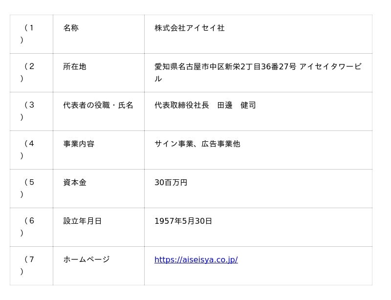 アイセイ社は1957年に設立(創業 1940年)され、愛知県を中心とする東海エリアと大阪府内において、中部国際空港 セントレアやバンテリンドームナゴヤといった特徴的な物件や当エリアにおける有名物件のサイン工事をはじめ、各種広告事業を展開する老舗企業となります。また、媒体元である鉄道事業者や大手ゼネコンとの繋がりが深く、多くの優良取引先を有するとともに、外注業者に対する適時適切な指導により高い品質を維持していることも特徴であります。