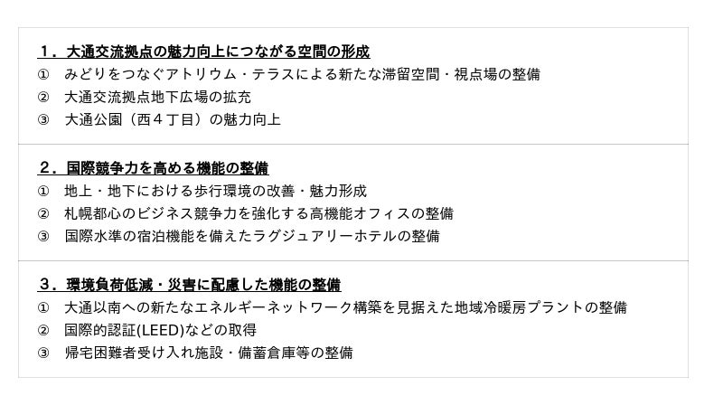本事業では、商業・業務・交流機能の充実、国際水準の宿泊機能としてのラグジュアリーホテル導入、重層的な歩行者空間の整備、大通以南初のエネルギーセンターの整備や環境配慮、防災機能の強化等を行うことにより、札幌都心の価値向上に寄与し、持続可能で魅力ある札幌都心をけん引する拠点の形成を目指してまいります。