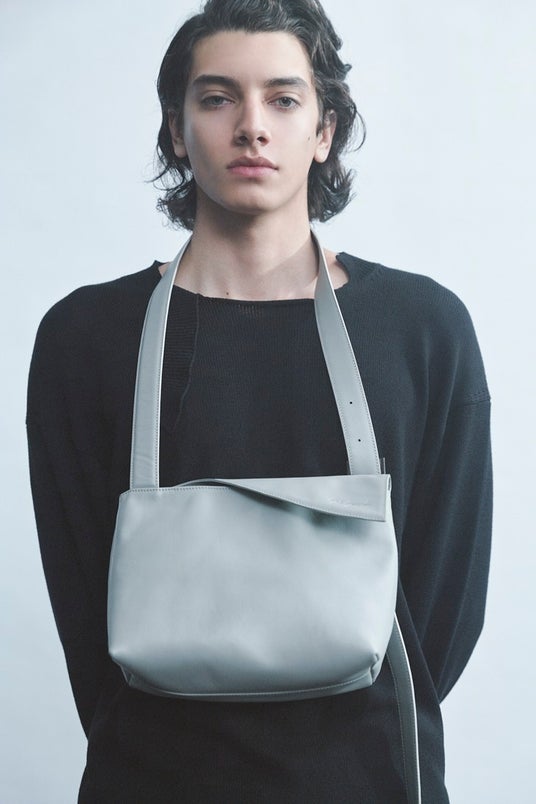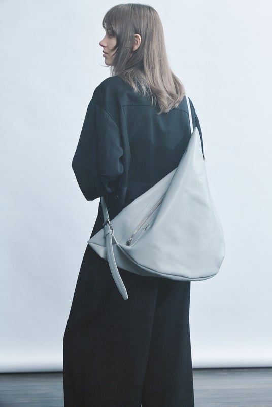 口元が非対称なかぶせで覆われた「VEIL」。見た目の印象と比較しボディの容量が大きいため、太めのショルダーがデザインされ、肩への負担を減らすように設計された機能的なデザイン。
