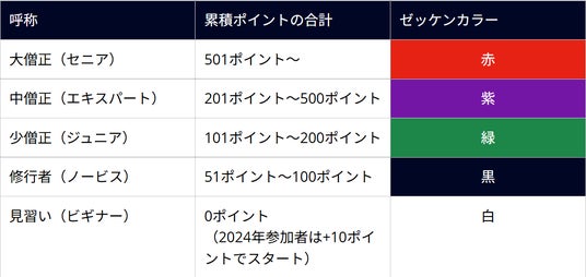 【翌年度のゼッケンカラーを決定する条件】前年度までの累積獲得ポイントが、翌年度のラリーにご参加いただく際のゼッケンカラーを決定します。本年度のラリー終了時に確定した累積取得ポイントに基づき、来年度の「僧位」が決定されます。