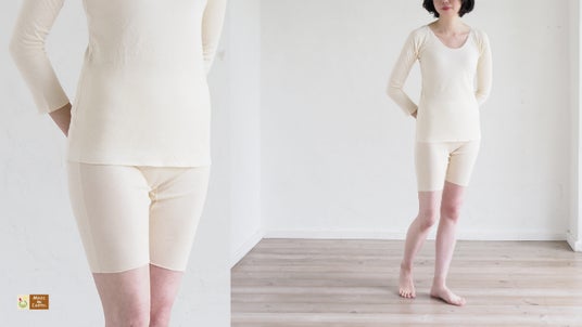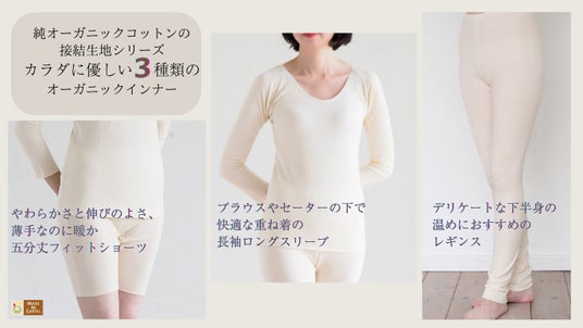 ・ブランド30周年!原料も加工も縫い糸までも天然素材を貫きつづける純オーガニックコットン・インナー・ペルー産の上質ピマオーガニックの接結ニット生地で、ストレスゼロを実現!長袖・レギンス・ショーツの3種