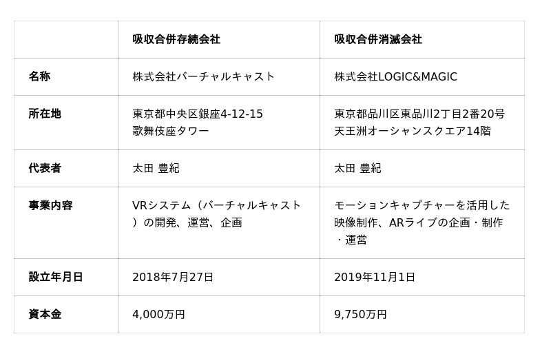 株式会社バーチャルキャスト(本社:東京都中央区、CEO:太田 豊紀/株式会社ドワンゴのグループ会社)と株式会社LOGIC&MAGIC(本社:東京都品川区、代表取締役社長:太田 豊紀)は、株式会社バーチャルキャストを存続会社とする吸収合併(以下「本合併」)を、2025年10月1日付で実施することをお知らせいたします。