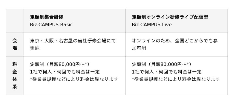 【1】定額制研修 Biz CAMPUS累計1200もの公開型研修開発テーマの中から、誰でも・何度でも受講できる定額制研修です。会場は、当社の研修会場かオンラインかお選びいただけます。10月3日(金)より、「新入社員研修」の予約を開始します。