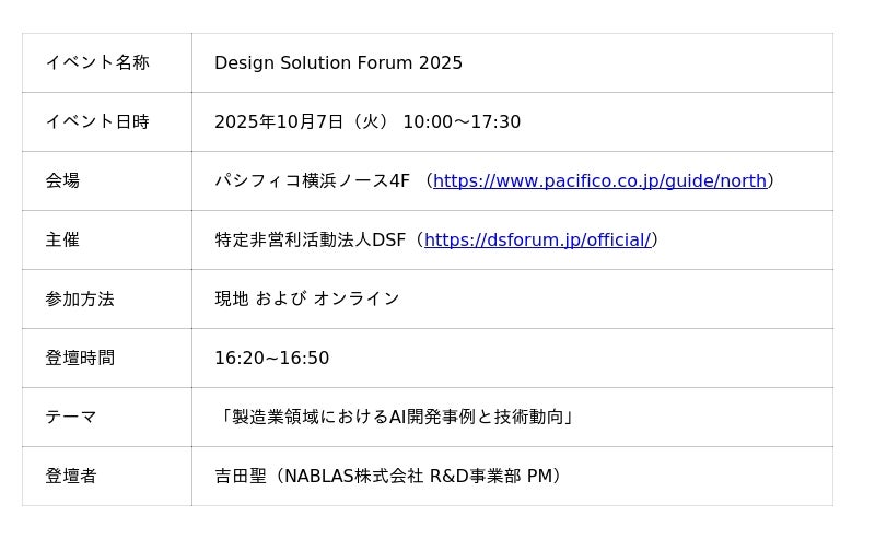AI総合研究所として活動するNABLAS株式会社 (本社 : 東京都文京区本郷、 代表取締役 所長 : 中山 浩太郎、 以下「当社」)は、組み込みシステムにおけるソフトウェアおよびハードウェアの設計事例や最新技術動向が発信される技術セミナー「Design Solution Forum 2025」において、当社のメンバーが登壇することをお知らせいたします。