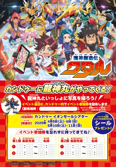 イオンモール キッズドリーム合同会社(所在地:千葉県千葉市美浜区豊砂1-5イオンモール幕張新都心エキマエ3階、代表職務執行者:末松央行)が運営する、仕事体験テーマパーク「カンドゥー幕張」(千葉県千葉市)は、1988年より始まったサンライズブランド作品であるオリジナルアニメ『魔神英雄伝ワタル』の神髄を継ぎながらも、新たな作品として紡がれる『魔神創造伝ワタル』とコラボレーションをしたイベントを期間限定で開催します。