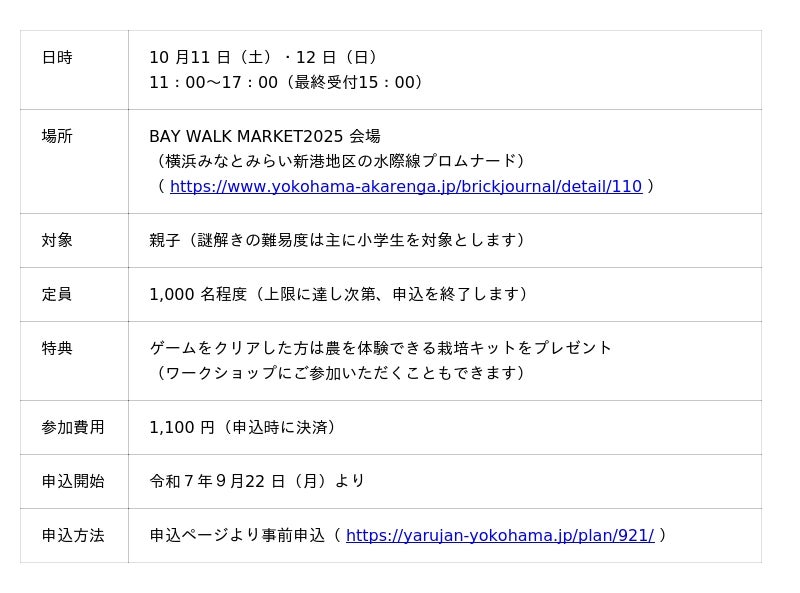 子育て世帯の気軽な農体験機会の創出を目的とする「すくすくファーム 横浜」の取組として、BAY WALK MARKET 2025(横浜みなとみらい新港地区・水際線プロムナード)を舞台に、横浜市とJA 横浜が連携し、農体験リアル謎解きゲームを開催します。親子が協力して会場内にあるヒントを基に解き進め、ゲームをクリアした方にはゲームのストーリーと関連したワークショップもご用意しています。