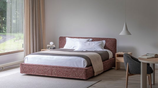 ソファのような柔らかさと、包み込まれるような安心感を寝室に。SOFFIO BED(ソフィオ ベッド)は、SOFFIOシリーズ共通のボリューム感を取り入れたフォルムで、これまでにない心地よさをもたらすベッドです。サイドボードとフットボードは厚み100mm以上のふくらみを持ち、ヘッドボードには大きく弧を描く曲線を施しました。その柔らかなふくらみは、名前の由来であるイタリア語の“SOFFIO(フッと息を吹き込んで柔らかく膨らんだもの)”を思わせ、寝室全体に穏やかで心地よい空気をもたらします。さらに、縁に配された「ボールドライン」が、柔らかな造形に上質なアクセントを添えています。SOFFIO BEDは、眠るだけの場所ではなく、読書や映画鑑賞、タブレットを見たりと、ベッドで過ごす時間をよりリラックスし、豊かなものにすることを目指しました。ヘッドボードには高密度ウレタンを使用し、肩口まで支える高さで設計。適度なストローク感と柔らかさを備え、ソファに身を預けるような快適さを実現しています。