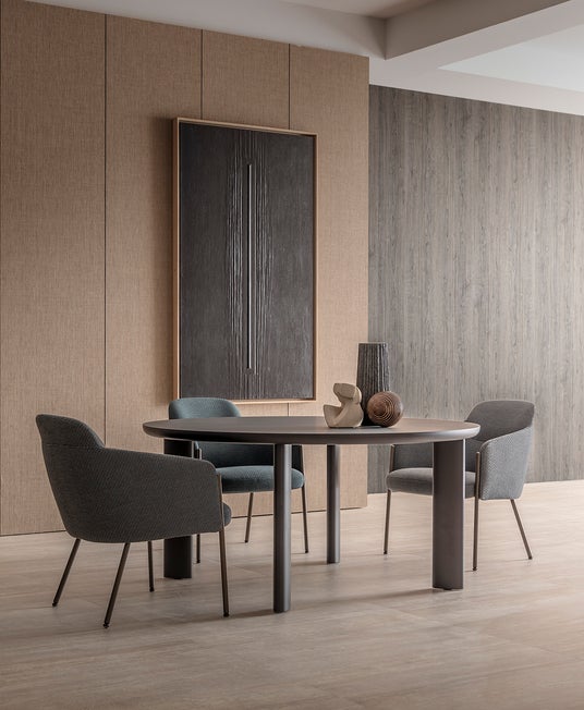 その中でも、新しいコミュニケーションを生むラウンド型のモジュラーソファSOFFIO ELEMENTI(ソフィオ エレメンティ)、クラシカルな気配と端正な佇まいを備えたODEON(オデオン)、やさしい質感のマットコーティングを採用したダイニングテーブルLIOR(リオール)は、コレクションを象徴する存在です。
