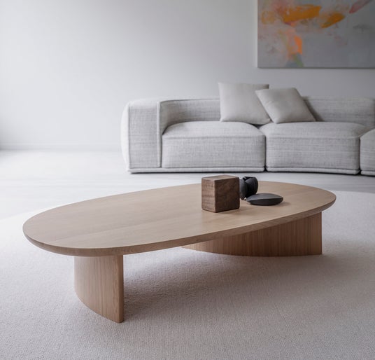 完全に非対称な造形がアートのような存在感を放つDEW COFFEE TABLE(デュー コーヒーテーブル)。オランダを拠点に活動するデザイナー、サビーン・マルセリスによる〈DEW〉シリーズに新たに加わったモデルです。2023年にEDIDA(エルデコ・インターナショナルデザインアワード) において「デザイナー・オブ・ザ・イヤー」を受賞したマルセリスらしい独創的な感性が息づき、リビング空間に唯一無二の個性をもたらします。天板と脚部はいずれも直線を持たず、見る角度によって表情を変える曲線で構成されています。無作為に見える造形は綿密に計算されており、動きと奥行きを空間に与え、まさに「デザインアイコン」と呼ぶにふさわしい佇まいです。天板には無垢材を用い、脚部は成形構造材に突板をプレス加工することで仕上げています。木の温もりと統一感のある木質仕上げが、空間に上質な落ち着きを添えます。