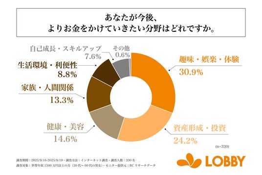 調査の最後、「今後、よりお金をかけていきたい分野」を尋ねる設問への回答では、1位が「趣味・娯楽・体験」で30.9%、2位が「資産形成・投資」で24.2%、3位が「健康・美容」で14.6%という結果になりました。この結果から、世帯年収1500万円以上の方が、今後よりお金をかけていきたい分野は主に「趣味・娯楽・体験」や「資産形成・投資」であることが明らかになりました。