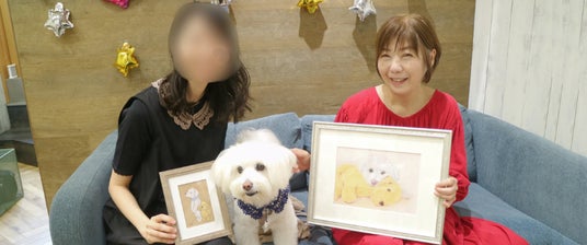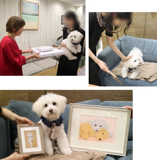 ももちゃんの普段の性格や好きな遊び、ももちゃんとの出会いやお気に入りのぬいぐるみのこと、手紙コンテストに応募した手紙の内容についてなどをヒアリング。実際にはせがわ氏がももちゃんと触れ合うことで、作品づくりのイメージを膨らませている様子でした。ヒアリングの間、ももちゃんは取材地である都内某所のカフェを少し探検してみたり、美味しそうなごはんの匂いをクンクンしてみたり、カフェに来る他のお客さんの⽝を見つけて少し興奮したりしながらも、おとなしく待っていました。どんなタイミングでもひかりさん(ペンネーム)から名前を呼ばれると、じっと目を見つめてきちんとお話を聞いている様子がとても印象的でした。対談をもとに、はせがわ氏が賞品の絵の制作に着手。額縁やマット(額縁と絵の間に挟む台紙)も、ももちゃんの雰囲気に合わせてはせがわ氏が選定し、世界にひとつだけの作品を作り上げました