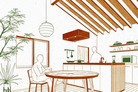 レンジフードのダクトカバーがなくダクトも露出しない、理想とするペニンシュラキッチンのカタチ。(イラスト:オノタツヤ)