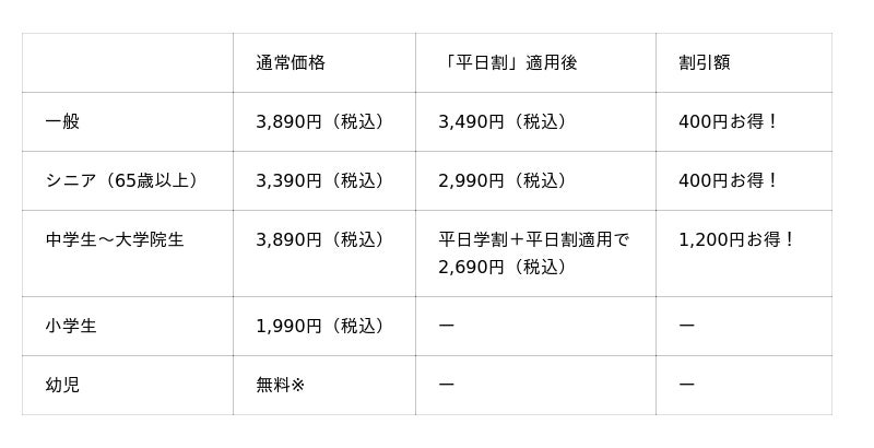 ※「平日割」の対象は一般・シニア料金のお客様です。