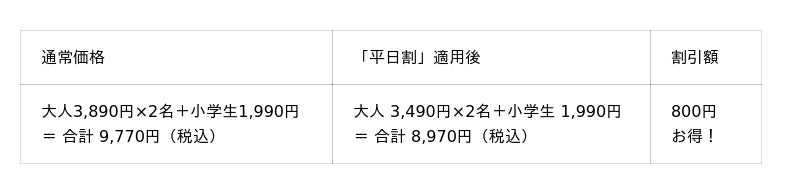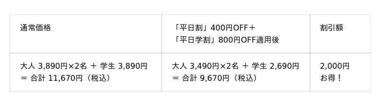 ※「平日割」・「平日学割」はキャンペーン開催期間中の土日・祝を除く平日のみが割引適用となります。