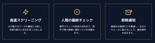 1. AIによる高速スクリーニング - 膨大な市場データを瞬時に分析し、相場より割安な物件を自動抽出します。