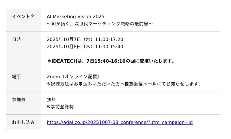 【10月7日(水)・8日(木)|カンファレンスのお知らせ】AIに自社商品の推薦をさせていくためのデジタルPR手法論を解説!「AI Marketing Vision 2025」にIDEATECHが登壇