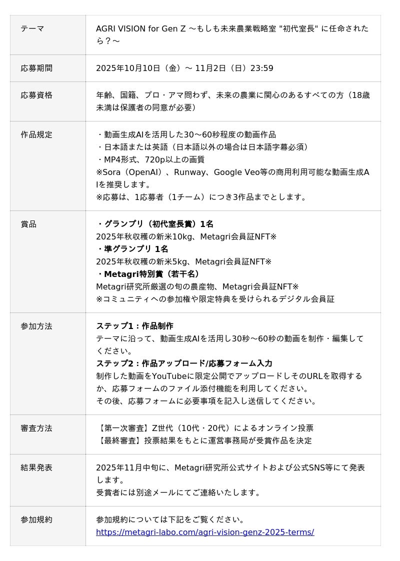 本コンテストは、日本農業が直面する「超高齢化」と「若者の関心低下」という深刻な課題に対し、動画生成AIの力を活用して、若者が魅力を感じる農業プロモーション動画を創出する、次世代共創プロジェクトです。審査員も10代・20代に特化し、農業の未来をZ世代自身が選ぶ新たな取り組みです。