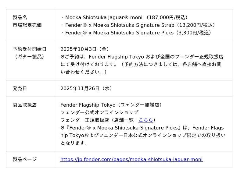 ァンを魅了する塩塚モエカの初のシグネイチャーギター『Moeka Shiotsuka Jaguar(R) moni』を2025年11月26日(水)に発売することを発表しました。さらに、塩塚モエカ本人がデザインを手がけたシグネイチャーストラップおよびピックも同時発売されます。これに先立ち、10月3日(金)より、Fender Flagship Tokyo および全国のフェンダー正規取扱店にて『Moeka Shiotsuka Jaguar(R) moni』の予約販売を開始します。