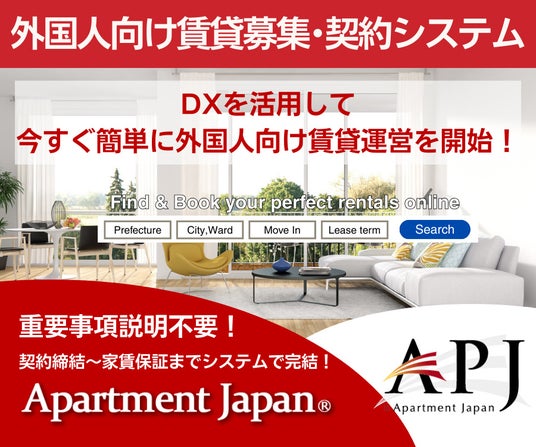 DID-GLOBAL株式会社が運営する「Apartment Japan」および「Apartment Japan-Luxe」は、外国人フレンドリーな条件(1ヶ月以上の中長期契約、保証人不要、クレジットカード決済対応など)で多様な物件を掲載する賃貸ポータルサイトです。家具付きマンション、シェアハウス、サービスアパートメント、ラグジュアリー物件などを幅広く掲載し、来日前からオンラインで物件検索、見積取得、申込、電子署名による契約、支払い、保証審査までをワンストップで完結できます。
