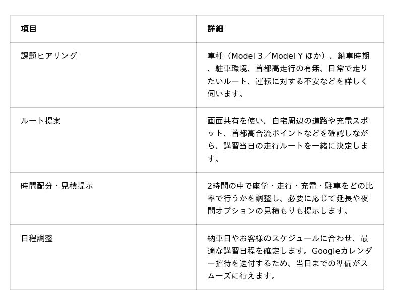 テスラマイカー講習は、すべてのお客様に同じ内容を提供するのではなく、お一人おひとりの車種・納車時期・生活圏・運転スキルに合わせた完全オーダーメイドプランで進めます。そのため、まずは無料の個別相談会から始めることをおすすめしています。