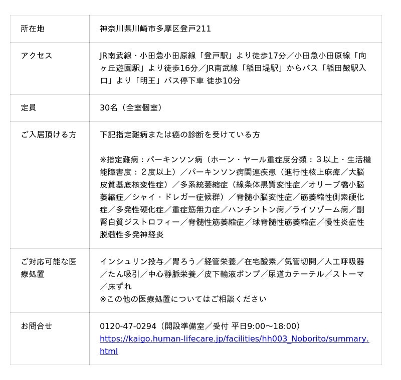 - 2026年3月1日(日)神奈川県川崎市多摩区にて住宅型ホスピス「ヒューマンライフケア登戸ホスピスホーム」を新規開設- 神経難病やがん末期の方を対象に、近隣の提携医療機関と連携し、介護・看護・医療がチームとなって24時間365日、きれ目なくサービスを提供