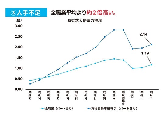 ▲トラックドライバーの有効求人倍率のグラフ 参考:国土交通省『物流の現状と課題について』令和6年12月23日(弊社より再デザインして使用)