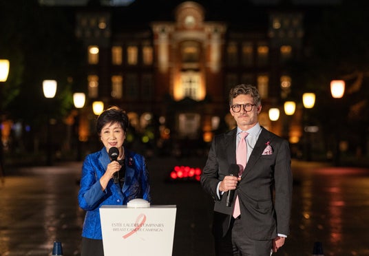 小池都知事「一人ひとりが自分ごととして捉え、乳がんのない世界を共に築いていきましょう」/ エスティ ローダー カンパニーズ ジャパン 「乳がんのない世界へ 2025」シークレットドローンショー 点灯式