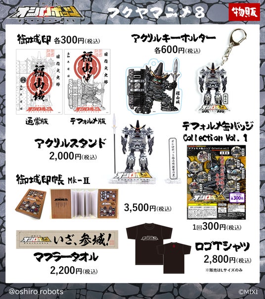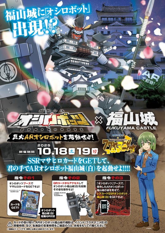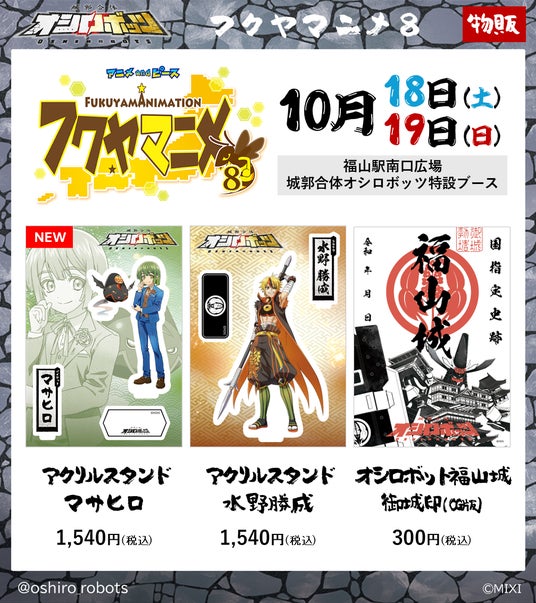 株式会社MIXI(東京都渋谷区、代表取締役社長 上級執行役員 CEO:木村 弘毅)は、2025年10月18日(土)、19日(日)広島県福山市にて開催される中国地方最大級のアニメイベント「フクヤマニメ8」にMIXI_ANIMEオリジナルコンテンツ『城郭合体オシロボッツ』のブースを出展、第2弾となるARキャンペーン「巨大ARオシロボット 福山城を起動せよ!」を実施します。ブースでは、オシロボット福山城のノベルティ配布、パイロット・マサヒロのアクリルスタンドをはじめとしたオシロボット福山城の関連グッズを販売します。