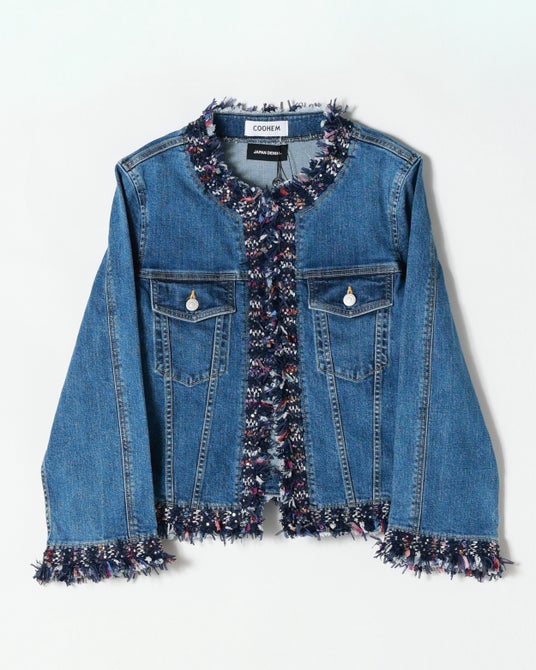 ポップアップストア限定で登場する、COOHEM(コーヘン)の人気ジャケット。ノーカラージャケットとデニムジャケットのディテールを融合し、ツイードテープとスパンコールで華やかさを加えたスペシャルモデルです。