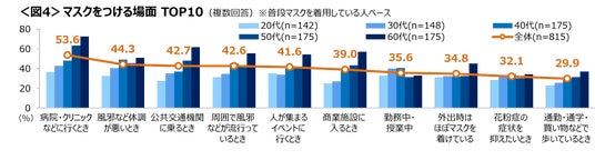 年代が高いほど各場面での着用率は上昇。特に病院や公共交通機関、商業施設などの人が集まる場所で顕著。<図4>