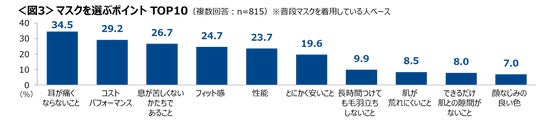 マスクを選ぶポイントは「耳が痛くならないこと」「コストパフォーマンス」「息が苦しくないかたち」がTOP3。<図3>