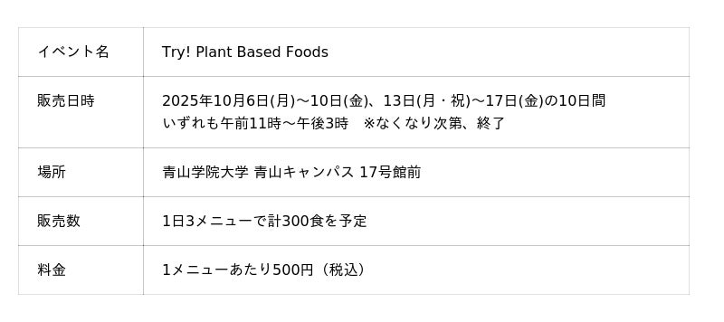 キユーピー株式会社(本社:東京都渋谷区、代表取締役 社長執行役員:高宮 満、以下キユーピー)は、青山学院大学(本部所在地:東京都渋谷区、学長:稲積 宏誠)と2024年12月から推進している産学連携プロジェクト※1の集大成として、GREEN KEWPIEのドレッシングなどを使った限定メニューを販売するイベント「Try! Plant Based Foods」を、2025年10月6日(月)から2週間※2、同大学の青山キャンパスで学生向けに開催します。