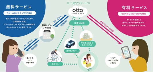 ottaが提供するIoTを活用した地域参加型のタウンセキュリティサービス『otta(おった)』は、専用端末を携帯する子どもが、域内に設置された「見守りスポット」や「見守りタクシー」、「見守り人」付近を通過することで位置情報が記録されます。