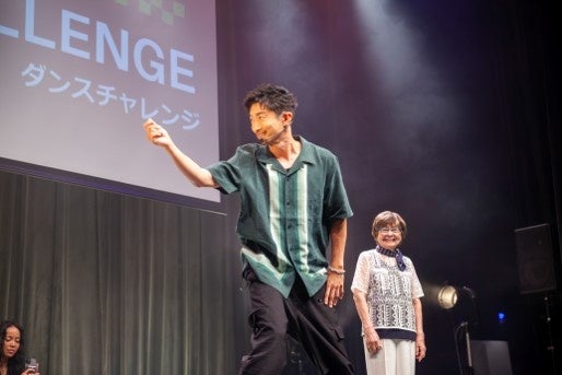 特別企画として実施された「ダンスチャレンジ企画」では、88歳の冨永 照子氏と93歳の滝野 文恵氏がステージに登壇し、 EXILE MAKIDAI氏のレクチャーのもと、 EXILEの「Choo Choo TRAIN」に合わせて、堂々としたダンスパフォーマンスを披露しました。EXILE MAKIDAI氏は、「高校生から始まり、ここまで年代順にパフォーマンスを披露していただきましたが、ここからは一気に年代が上がります!本日は特別企画として、88歳~93歳のみなさんと一緒に“Choo Choo TRAIN”でダンスチャレンジを行います!私はダンスを続けて約35年になりますが、ダンスは年齢に関係なく、誰でも楽しめるものです!」と語り、会場を大いに盛り上げました。EXILE MAKIDAI氏の丁寧なレクチャーにより、参加者だけでなく観客も一体となり、会場全体が「Choo Choo TRAIN」のリズムに包まれました。「ダンスに年齢は関係ない!」ということが証明されたひとときでした。